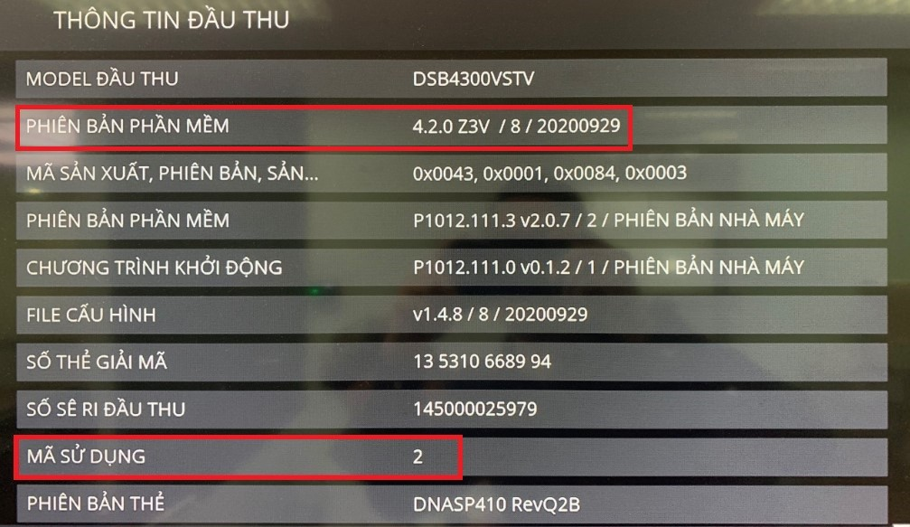 Bước 1: Sử dụng điều khiển ấn phím Menu → chọn mục Cài Đặt → chọn mục Thông Tin Kỹ Thuật → Chọn mục Thông Tin Đầu Thu. Màn hình sẽ hiển thị bảng thông tin đầu thu như bên dưới: